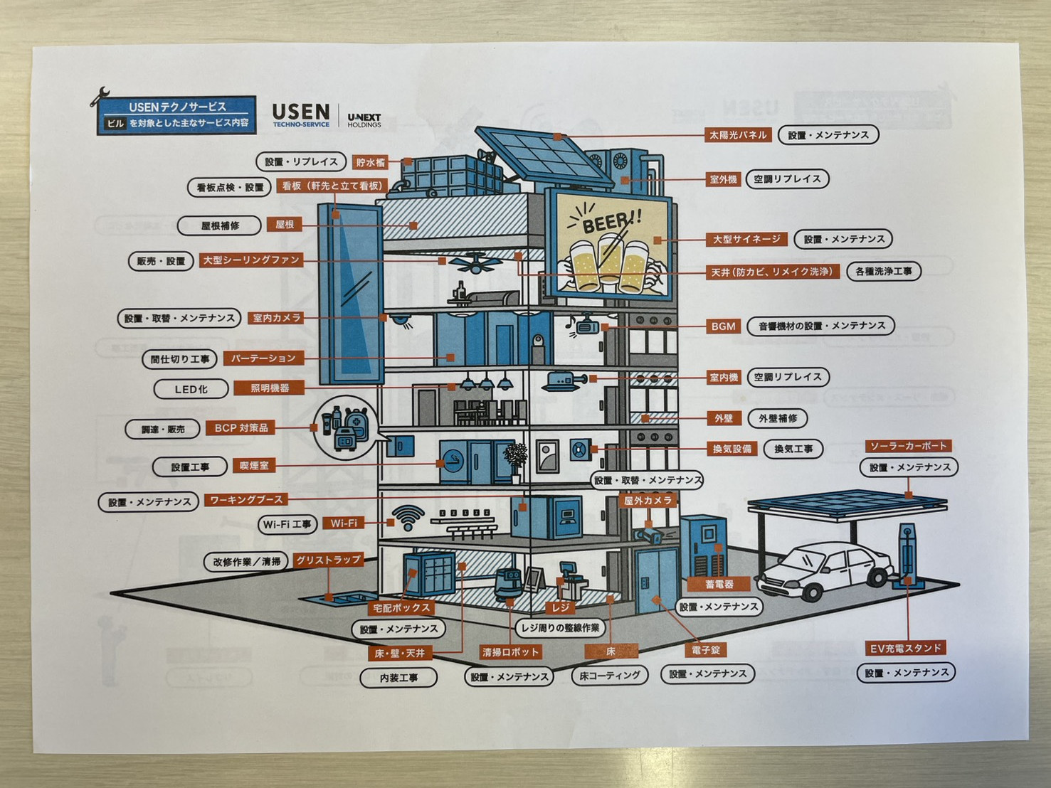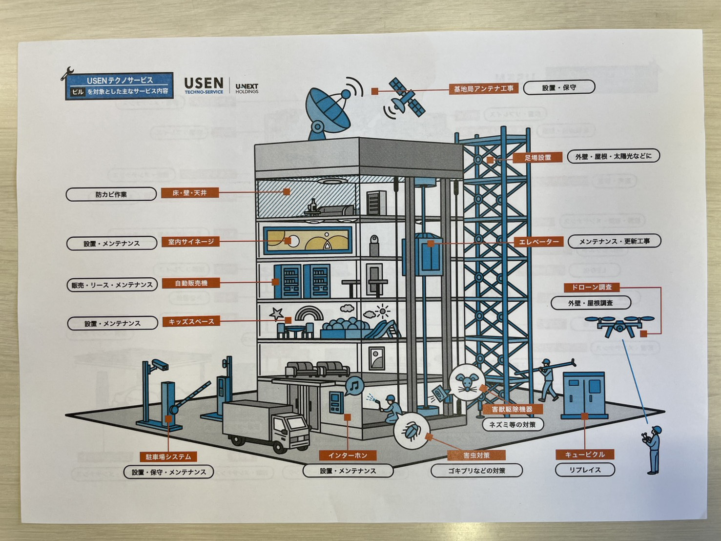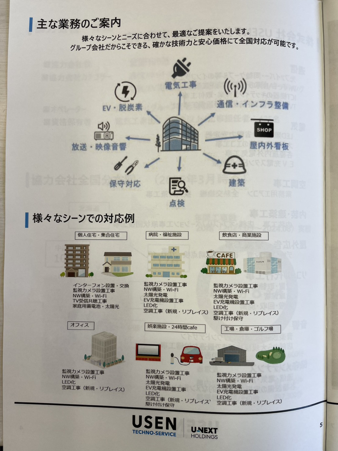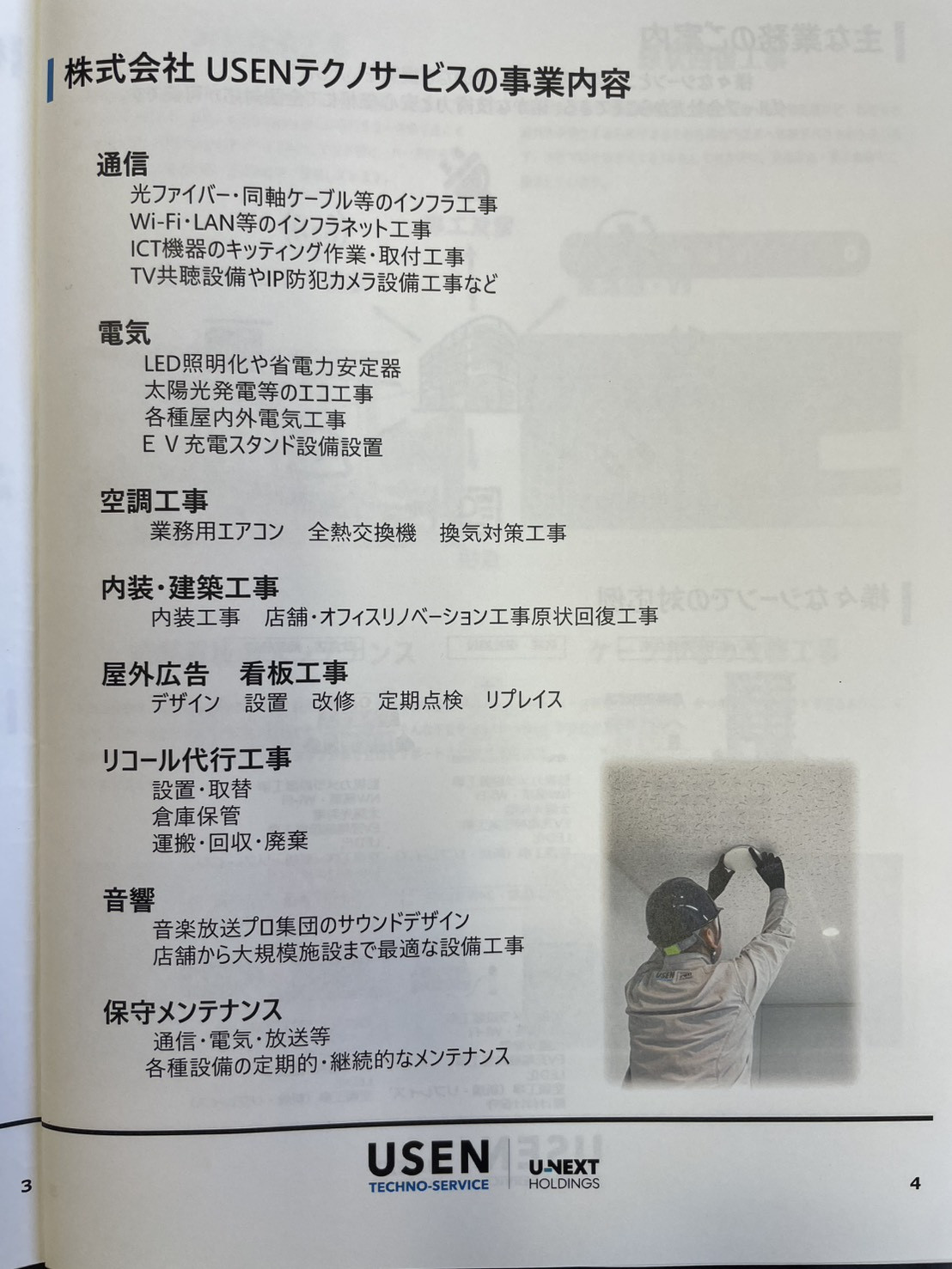 USENが最も強い「通信」から始まり、電気工事、空調工事、内装・建築工事、屋外広告・看板工事、リコール代行工事、音響、保守メンテナンスを行っています。